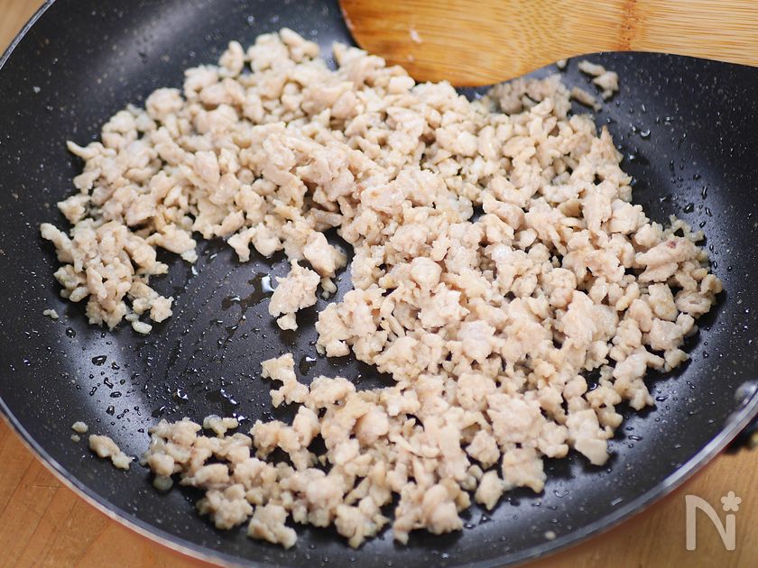 (2) フライパンにサラダ油(大さじ1、分量外)をひき、鶏ひき肉に塩ひとつまみ(分量外)を振り、強めの中火でしっかりと炒める。