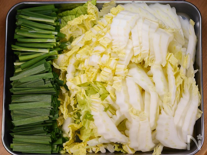 (1) ○白菜は繊維を断ち切るように1㎝幅のそぎ切り、ニラは5㎝のざく切りにする。