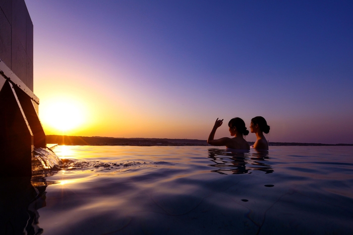 13階の屋上に位置する天空露天風呂からは加賀の街並みを一望でき、まるで空に浮かんでいるような感覚を味わえます。時間帯や季節によって変わる景色は、思わず時間を忘れてしまう美しさ。きらめく夜景を一望できる夕暮れから夜の時間帯が、特におすすめです。