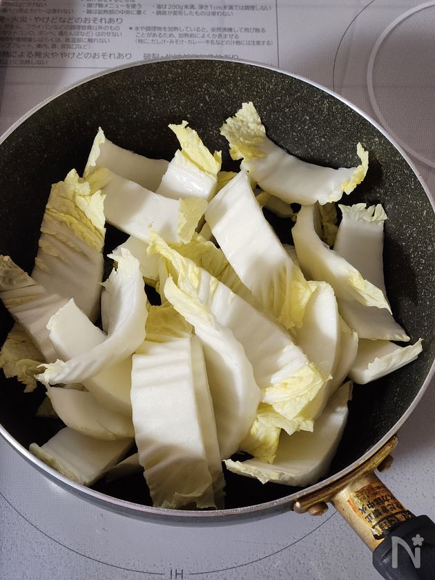(2) 深めのフライパンにサラダ油をひき、白菜の芯を中火で約5分炒める。