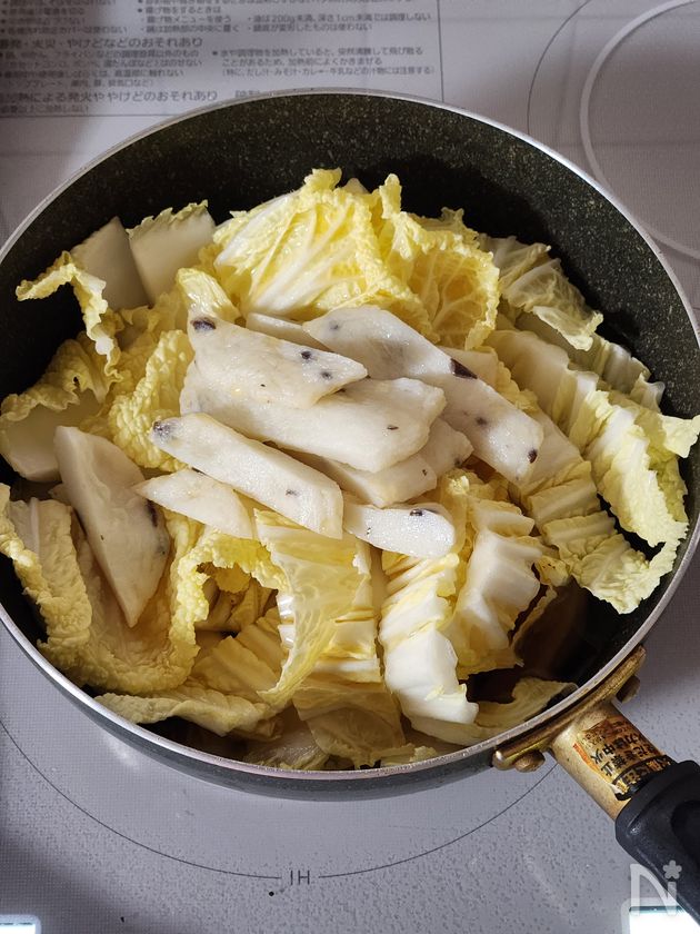 (3) 白菜の葉とひら天と【A】を加え、蓋をして弱中火で約8分~10分煮る。