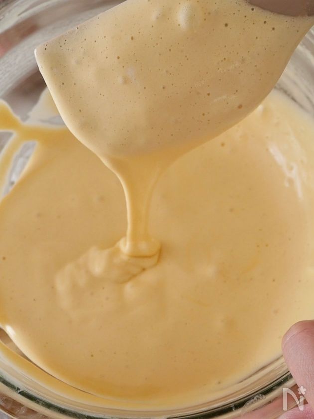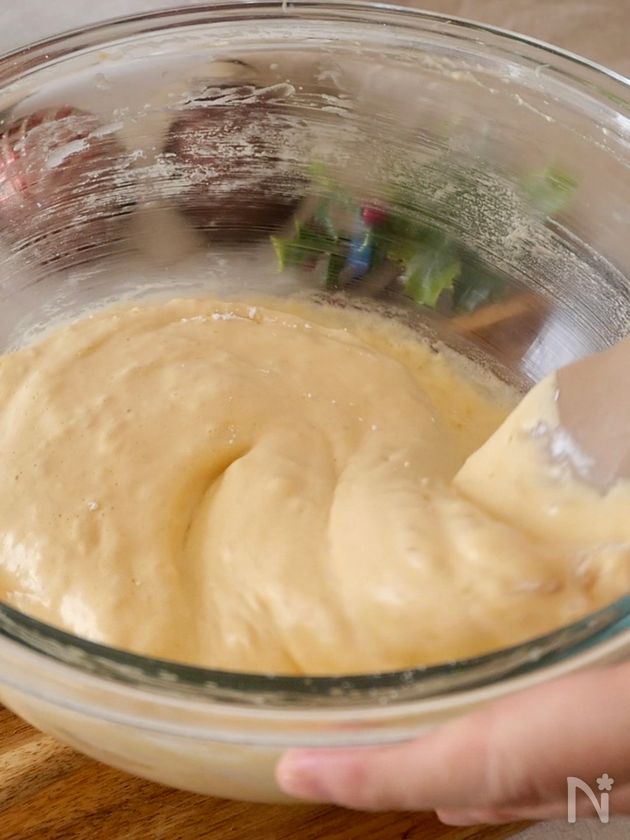 (4) 人肌に温めた無調整豆乳に生地をひとすくい入れてよく混ぜ、混ざったら元の生地に優しく入れる。
