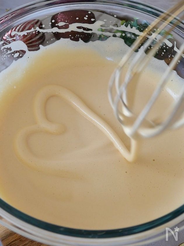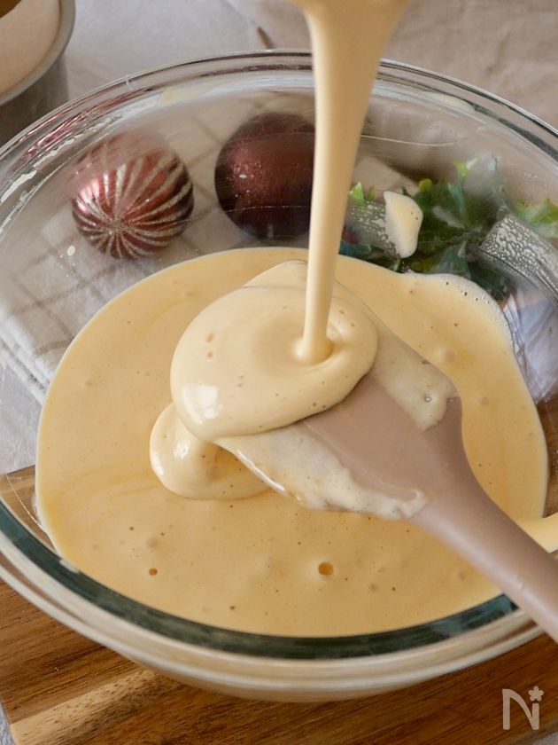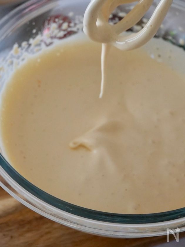 (1) 【A】を合わせてハンドミキサーの高速で約5分泡立てる。もったりして線が残るくらい