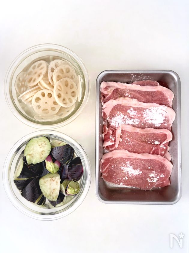 (1) 豚ロース薄切り肉は、塩こしょうをして、片栗粉をまぶす。