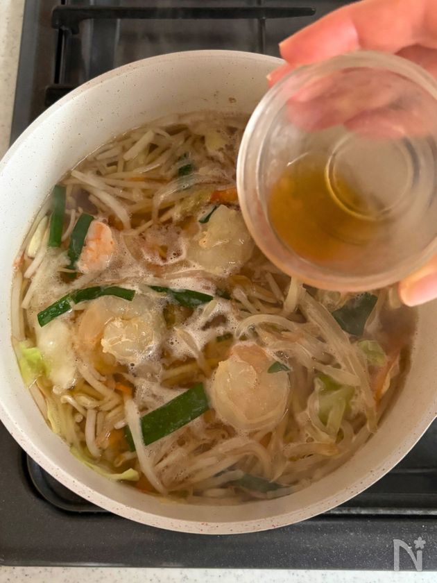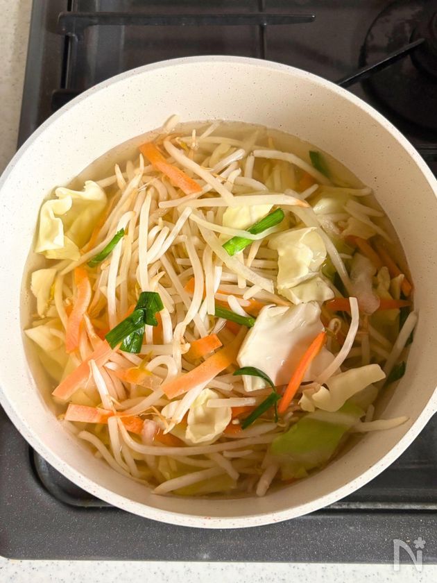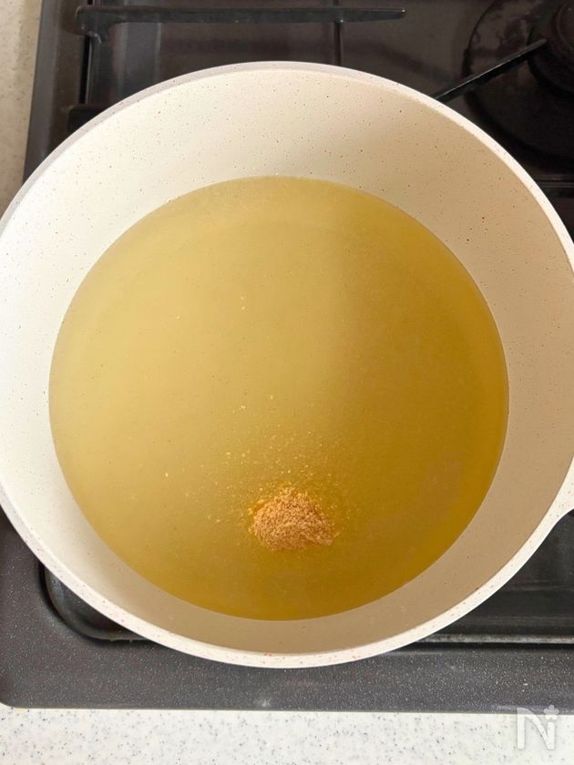 (1) 鍋に水を入れて中火にかけ、顆粒鶏がらスープの素を溶かす。