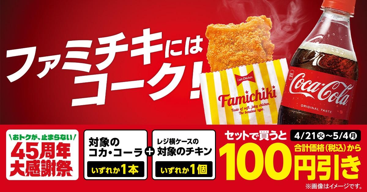 4月21日から5月4日までの期間、対象のコカ・コーラ(いずれか1本)と対象のチキン(いずれか1個)をセットで購入すると、合計価格から100円引きになります。