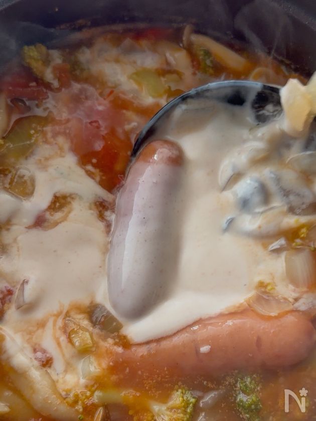 簡単【ウィンナーとたっぷり野菜の腸活ヨーグルトトマトスープ】