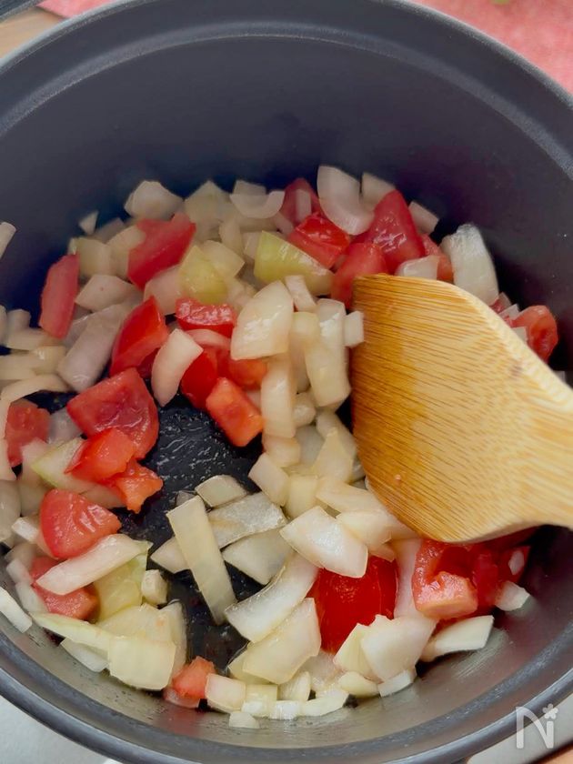 玉ねぎを加えて炒め、全体に油が回ったらトマト、ブロッコリーの茎も加えてしんなりするまで炒める。