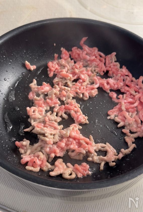 (1) フライパンに豚ひき肉を入れ、中火にかける。