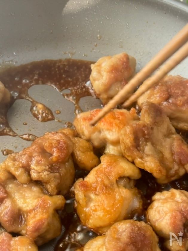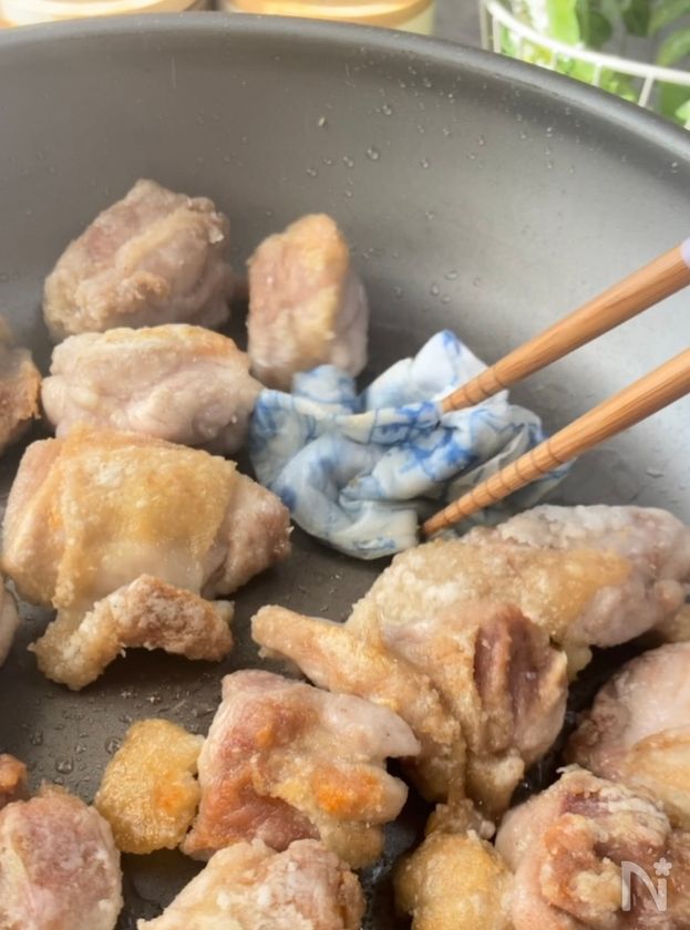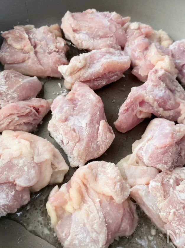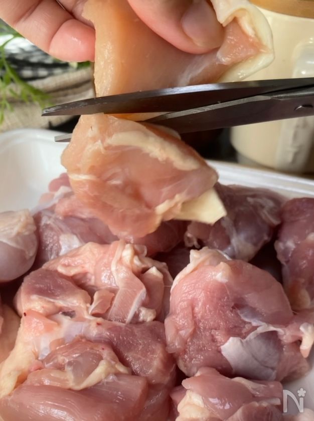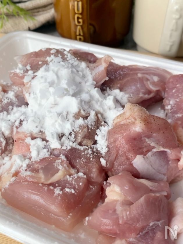 鶏肉をハサミで切って、パックの上で塩こしょう、片栗粉をつけると包丁まな板使わずに、パパっと洗い物も少なく作れます◎