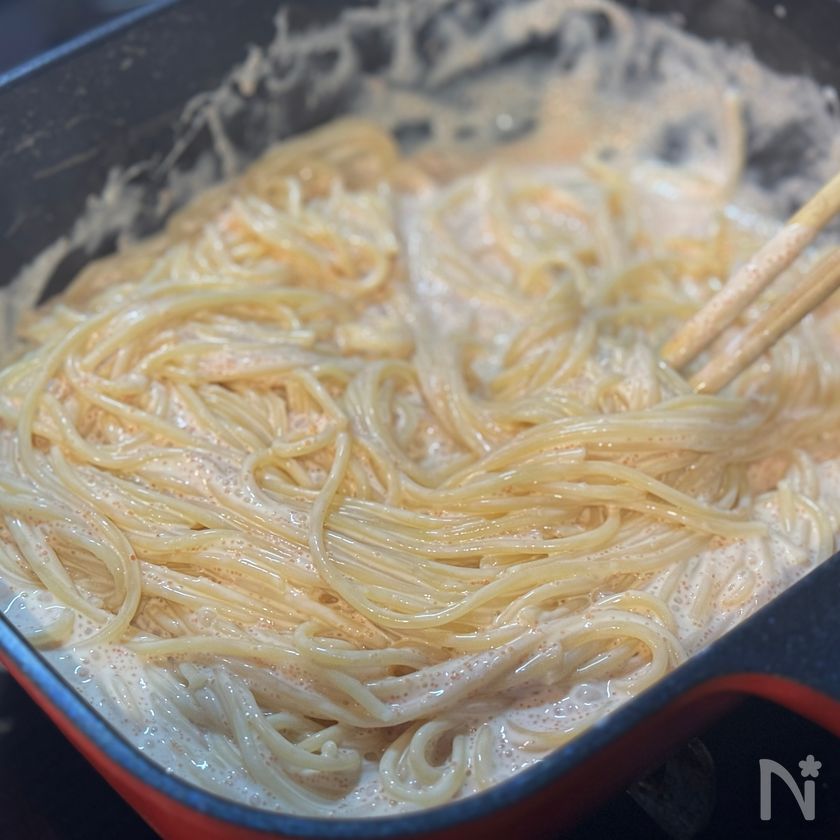 (2) スパゲティが茹で上がったらザルにあげて、1のフライパンに、皮から取り出した明太子と【A】を入れて弱火にかける。
