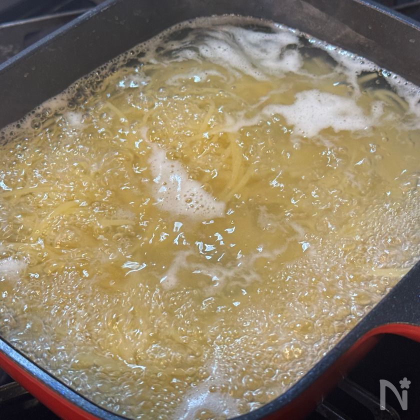 (1) フライパンに1.5Lの湯を沸かし、塩を加えてスパゲティをお好みの時間茹でる。