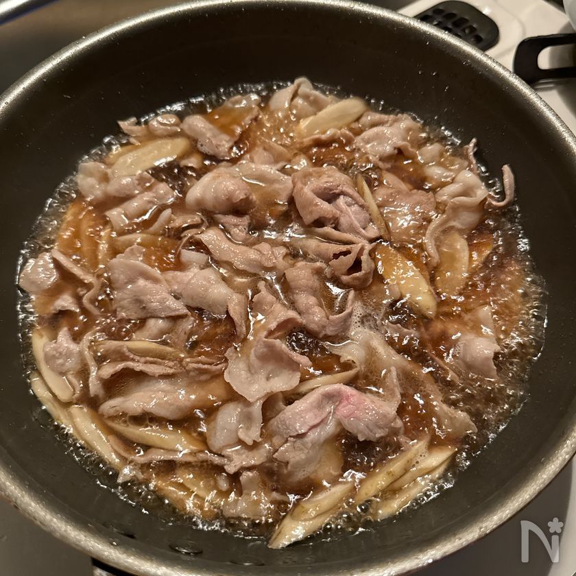 ・テフロン加工のないフライパンならば、うすくサラダ油をひいてから豚バラとごぼうを炒め始めてください。