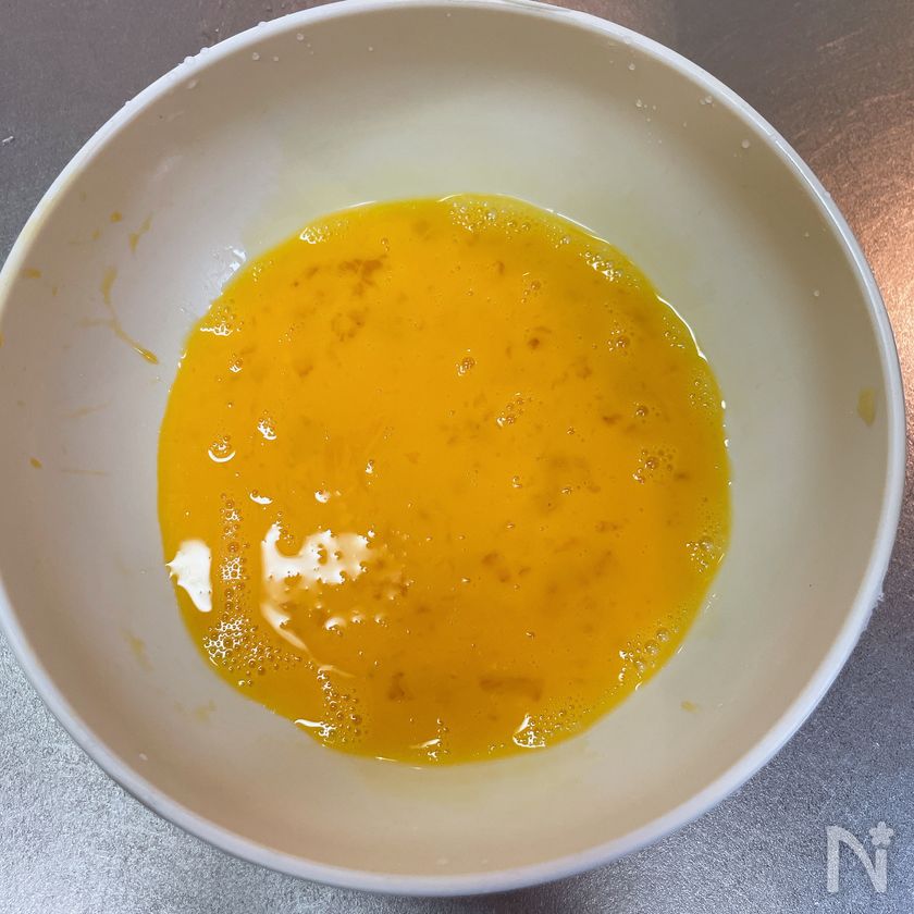(下準備) たまごはボウルな割り入れてよくときほぐしておく(一旦ときほぐしたら、ドロっとするかたまりを菜箸で持ち上げて、サラッとするまで何回かほぐすと綺麗な仕上がりになります)