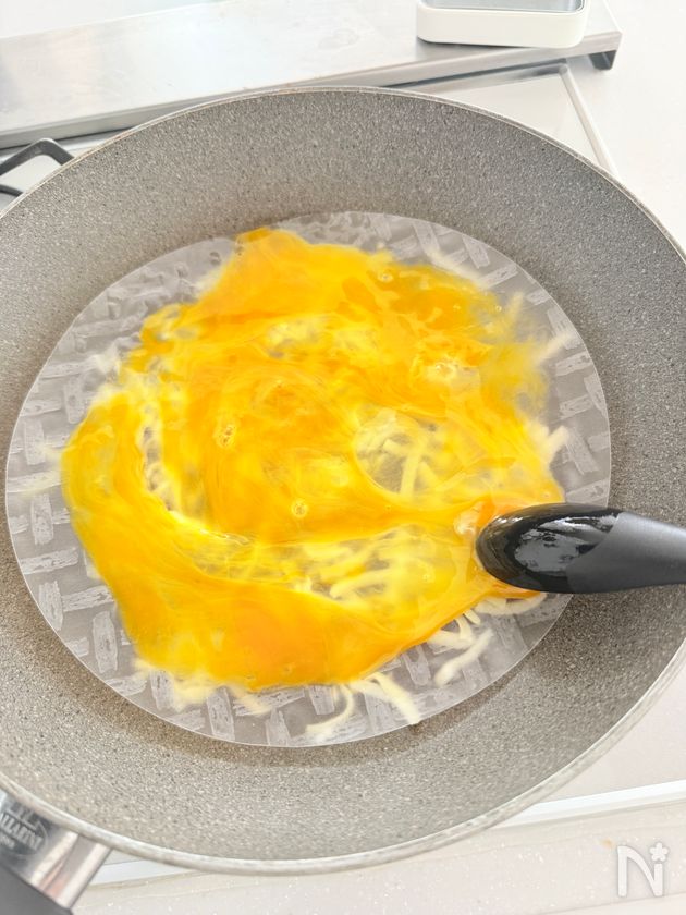 (2) ライスペーパーをのせ、その上で卵を割ほぐして全体に広げ、塩胡椒をする