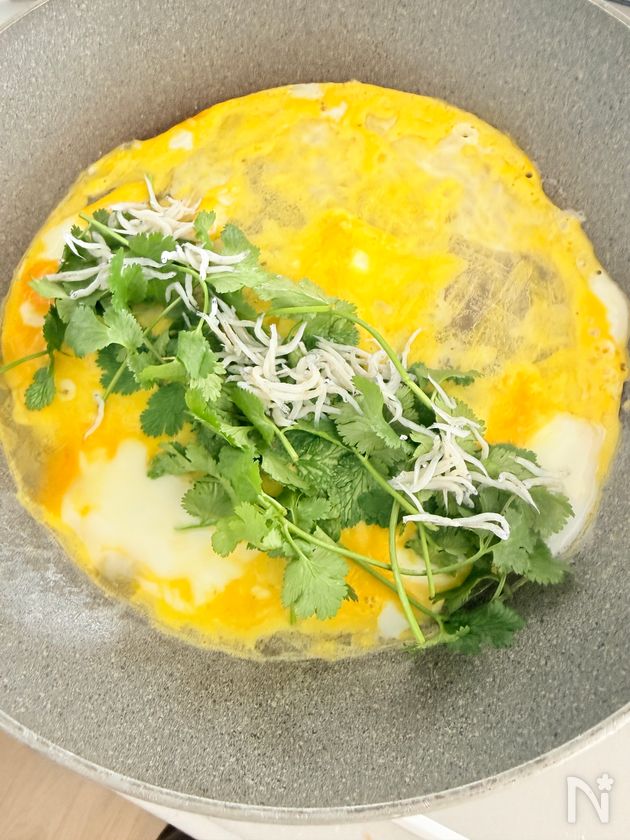 (3) 火をつけ、卵が半熟程度になったら、パクチーとしらすをのせる