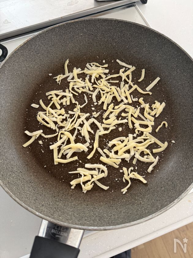 (1) フライパンにシュレッドチーズを広げる
