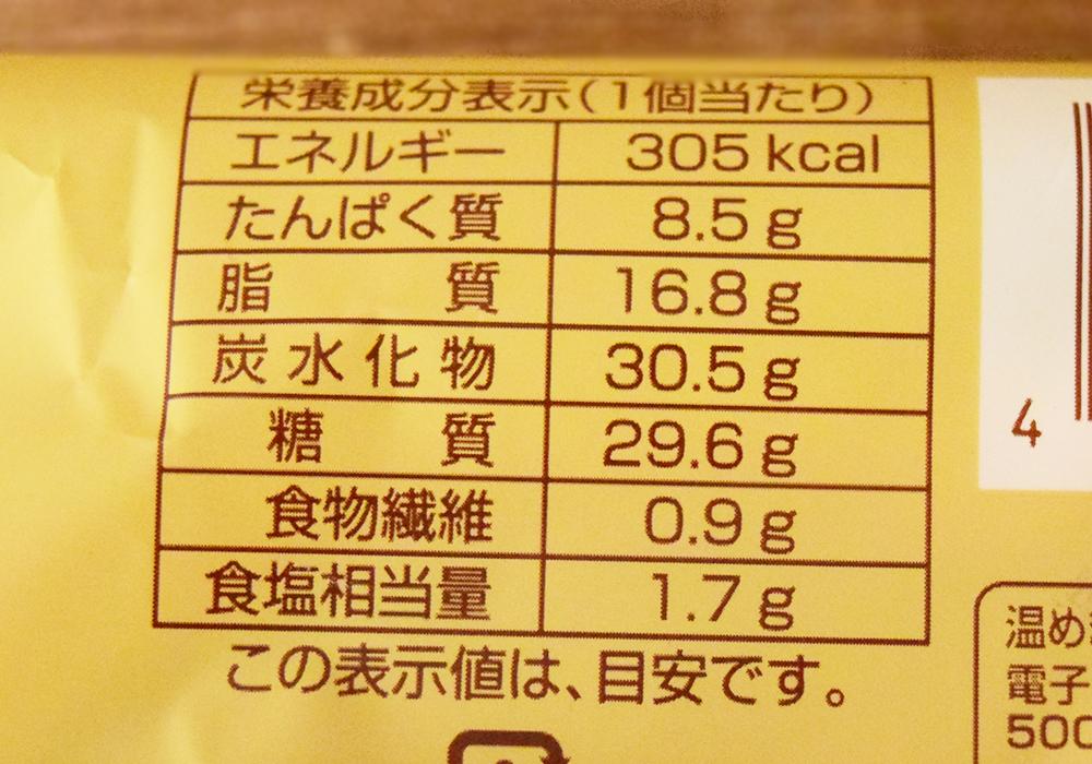 1個あたり305kcal、たんぱく質8.5g、脂質16.8g、炭水化物30.5g、食塩相当量1.7gです。