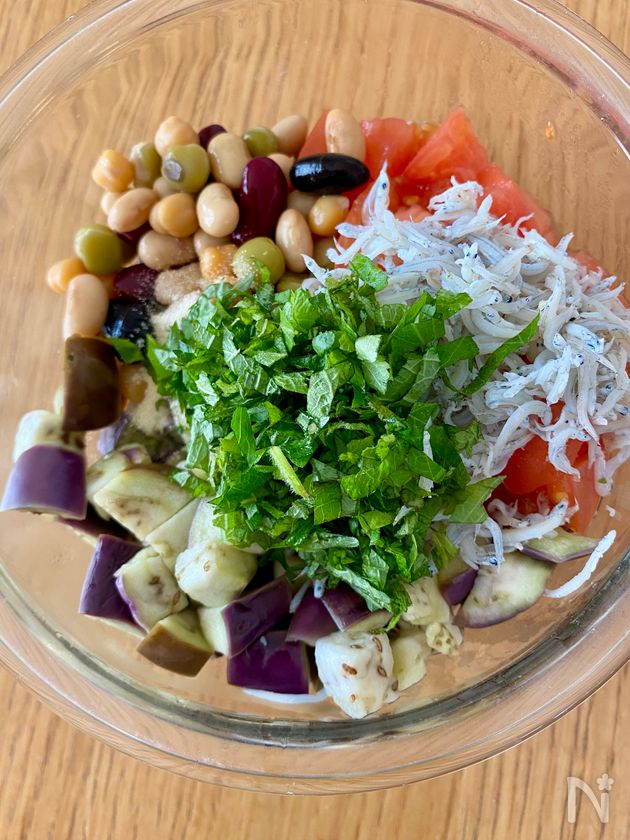 (1) ボウルになす・トマト・ミックスビーンズ・しらす・大葉・【A】をいれて混ぜる。