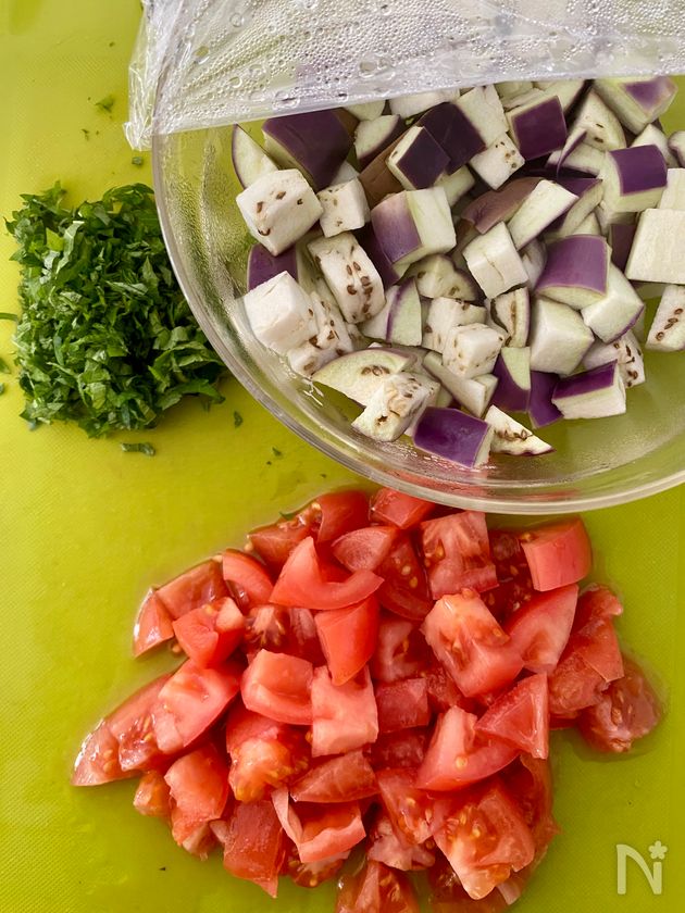 (下準備) なすは1㎝角に切り、洗ったら水けのついた状態で耐熱ボウルにいれ、ふんわりとラップし、600Wのレンジで3~4分加熱する(なすが柔らかくなるまで)加熱後、水けをとり、粗熱をとる。