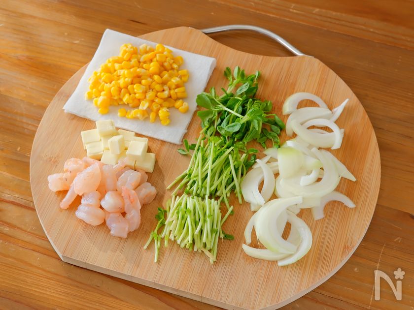 ・コーン(缶詰/ホールタイプ)はペーパータオルで包み、しっかり水けをふき取る。