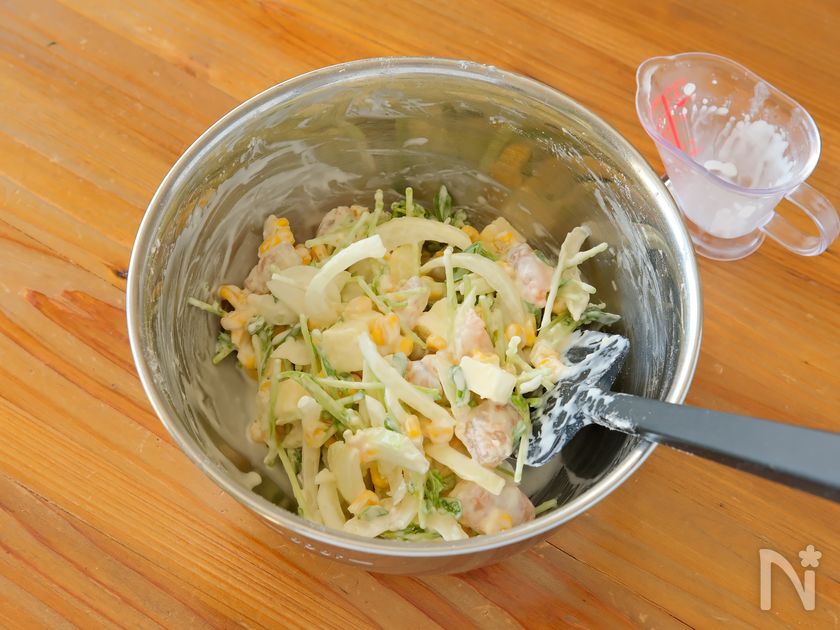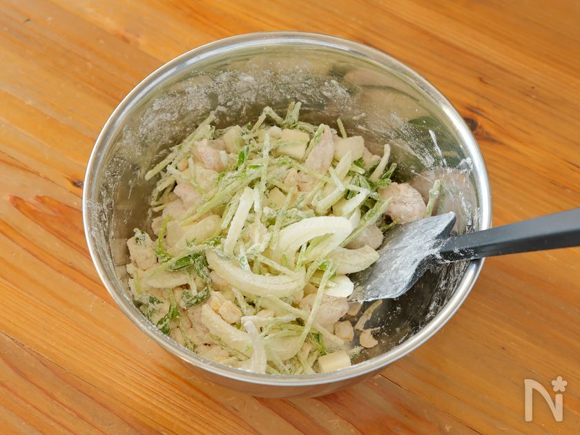 (2) ボウルに1と【A】を入れ、混ぜて粉をまんべんなくまぶす。