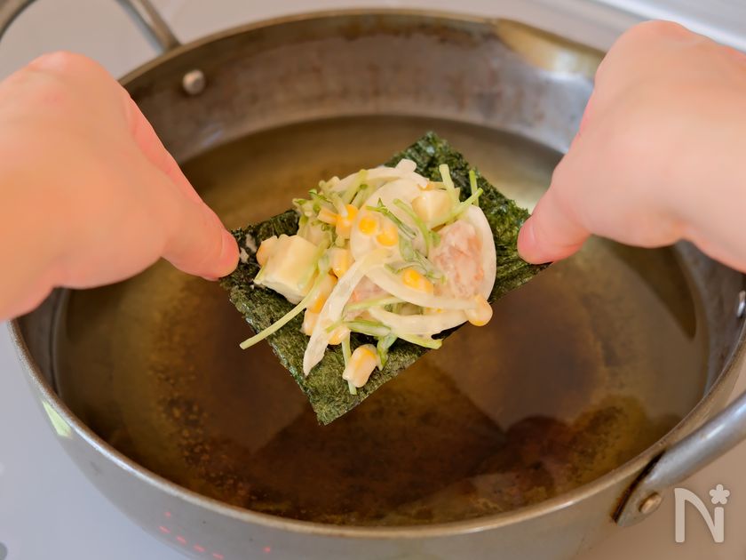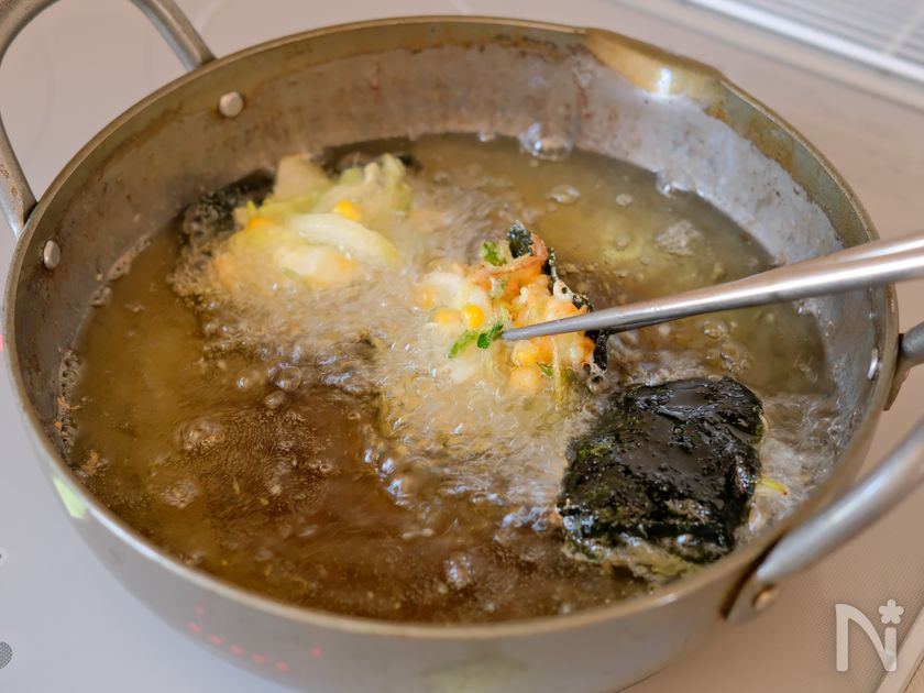 (5) 焼きのりの両端を持ち、揚げ油に静かに浮かべ、触らずに約1分揚げる。
