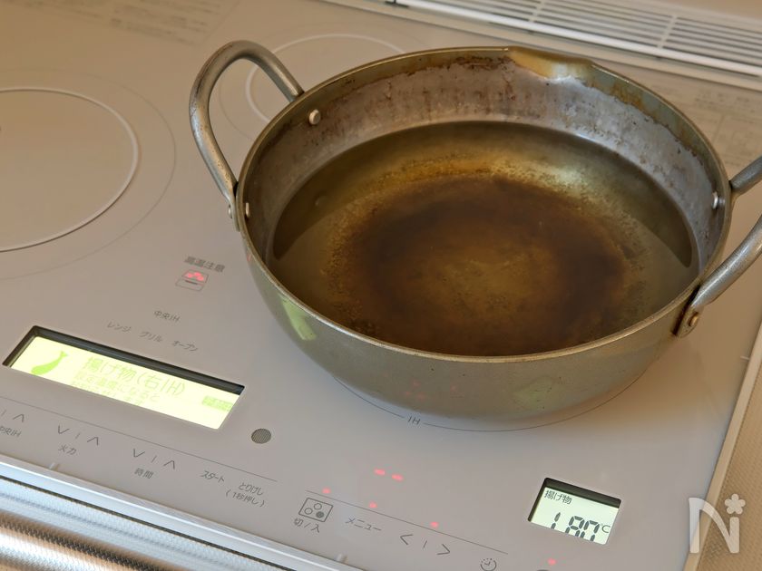 (下準備) 揚げ物用鍋に鍋底から3cm以上揚げ油を入れ、揚げ物<180℃>に設定する。
