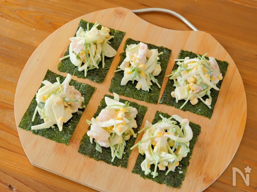 (4) 焼きのりを6等分に切り、のりの中央に爪楊枝で1~2ヶ所穴を開ける。3をふんわりと、つぶさないように等分にのせる。