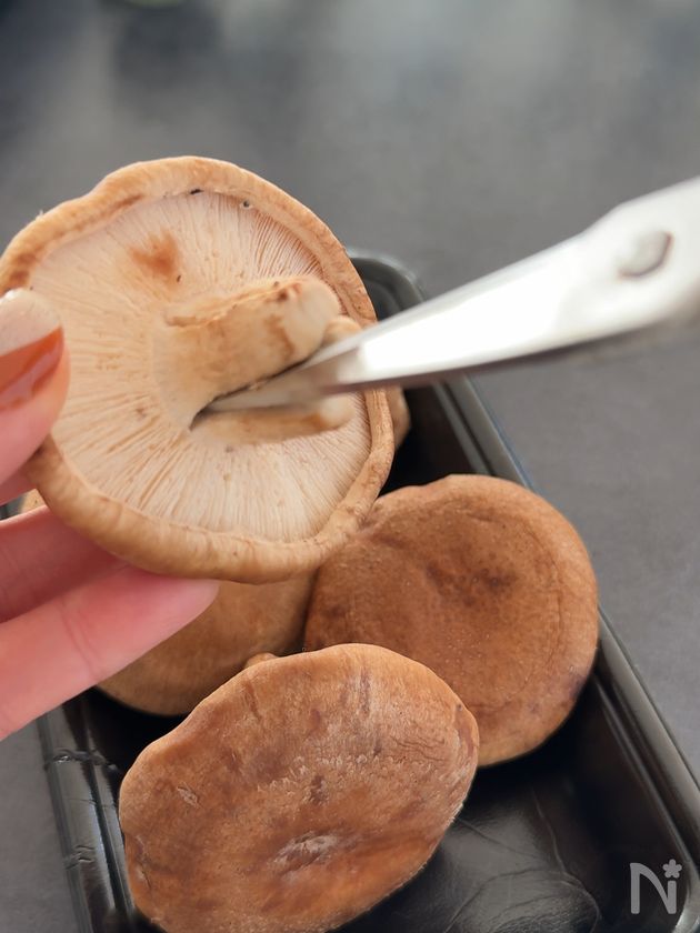(下準備) しいたけは石付きを切り落とし、汚れをさっと拭き取る。