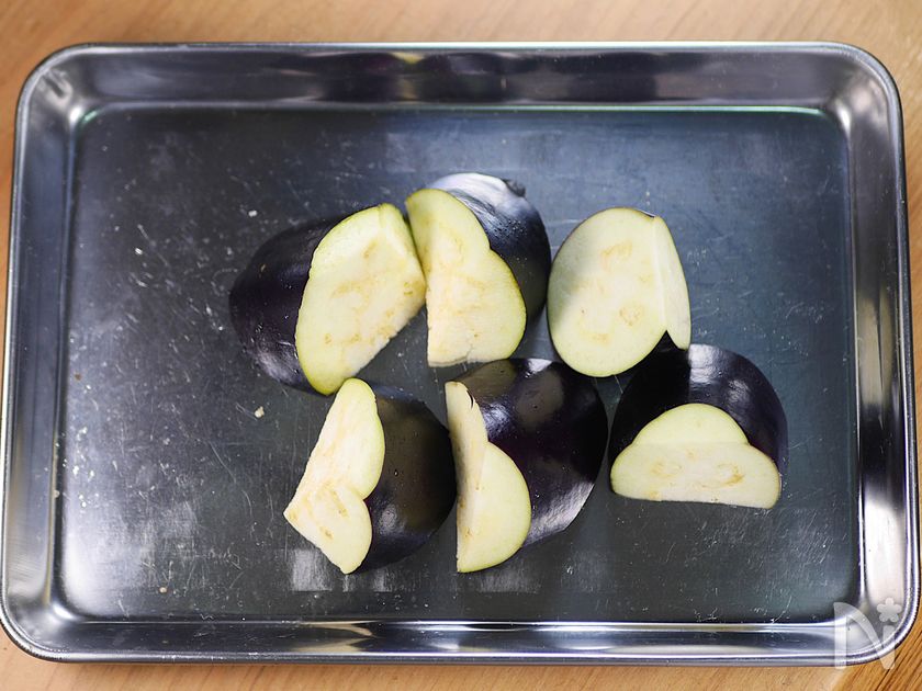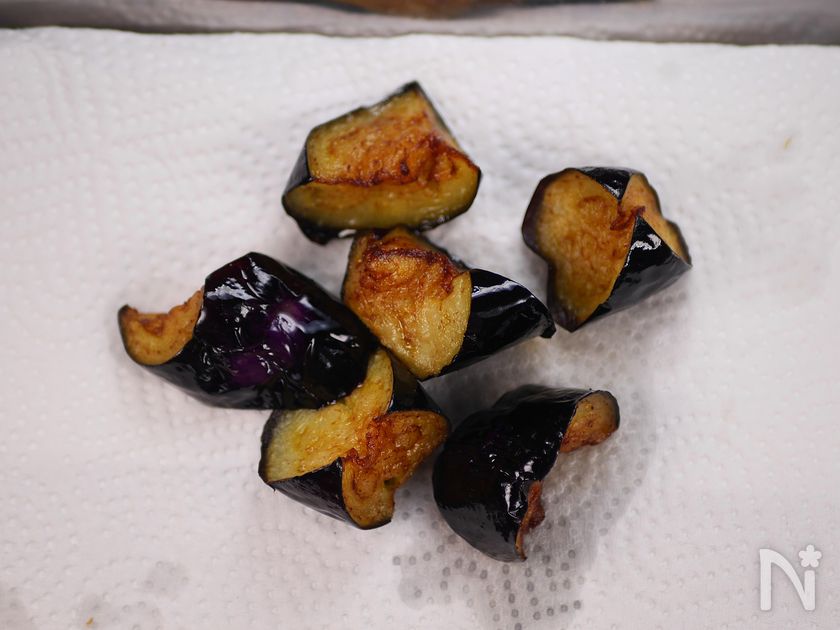(2) 揚げ油を180度に熱し、なすを約3分素揚げする。
