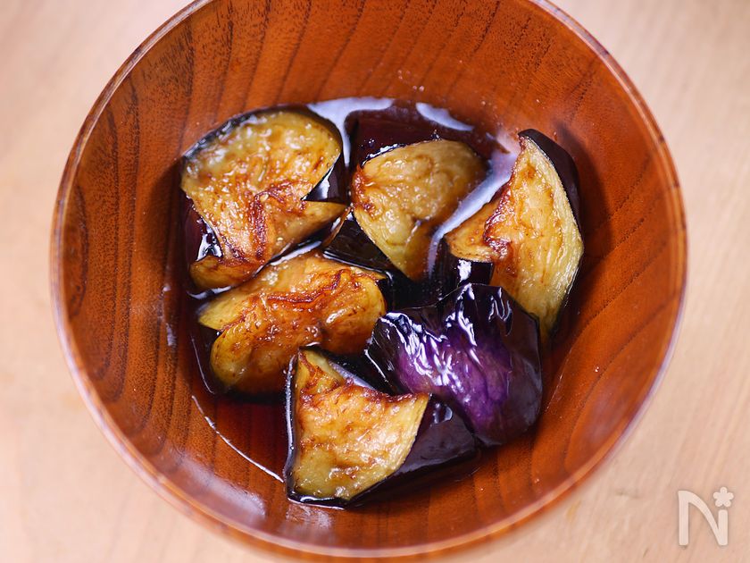 (3) お椀に揚げたなす、【A】を入れ、しばらく浸す。