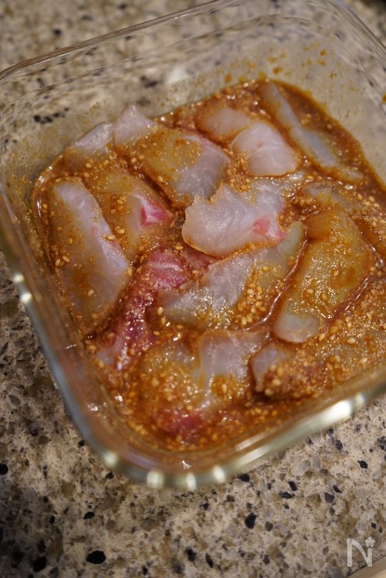 (1) 容器に鯛と【A】を入れて混ぜる。
