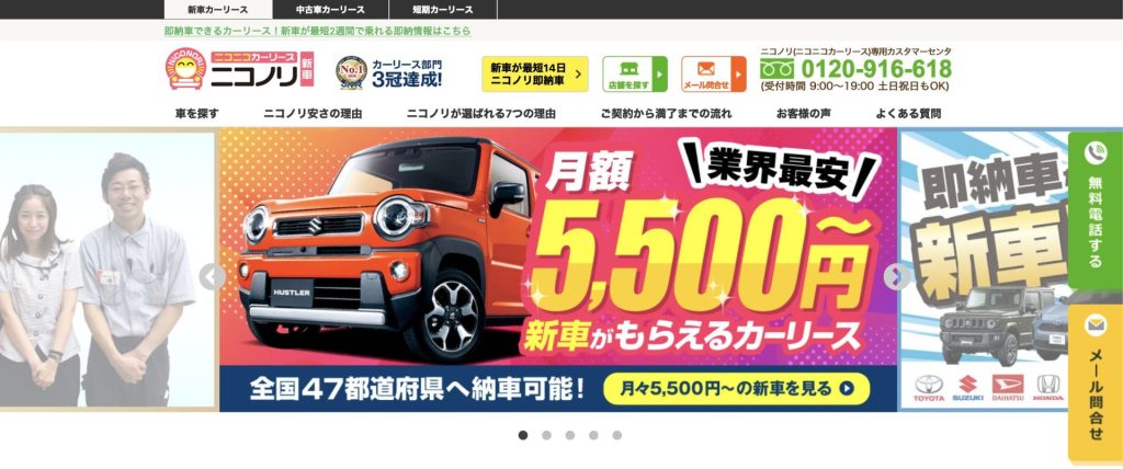 リース料金、車種の選択肢、走行距離、サポート体制などを総合的に判断した結果、もっともおすすめなのが「ニコノリ」です。