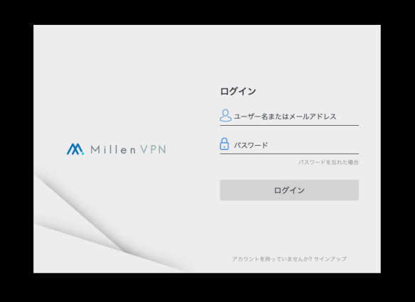 この時に入力するユーザー名とパスワードはステップ4で確認した「【MillenVPN】MillenVPNへようこそ」がタイトルのメールに記載されています。