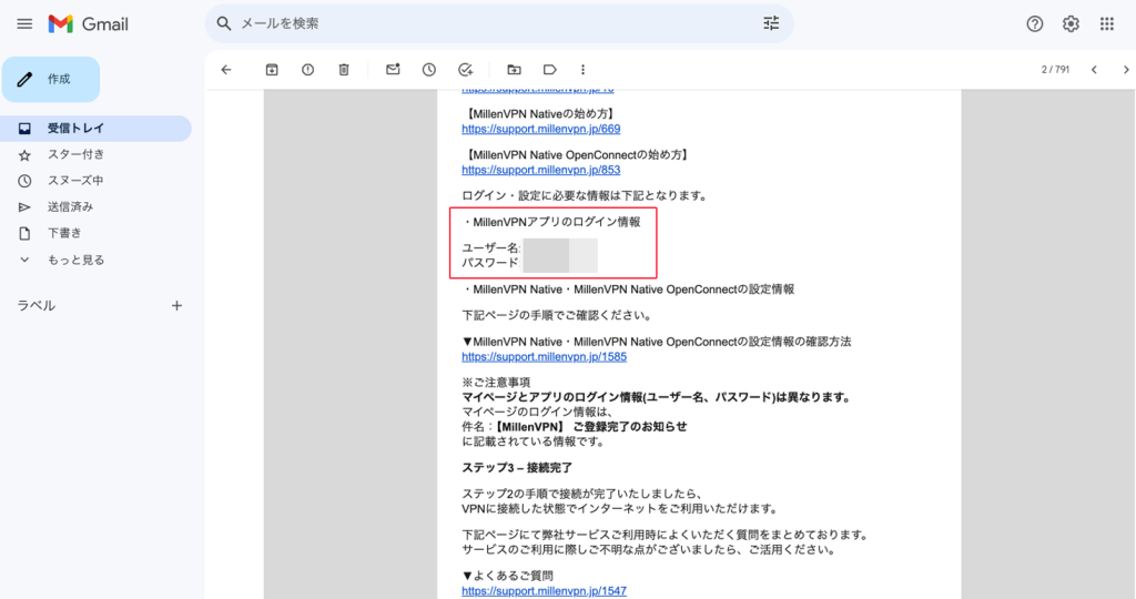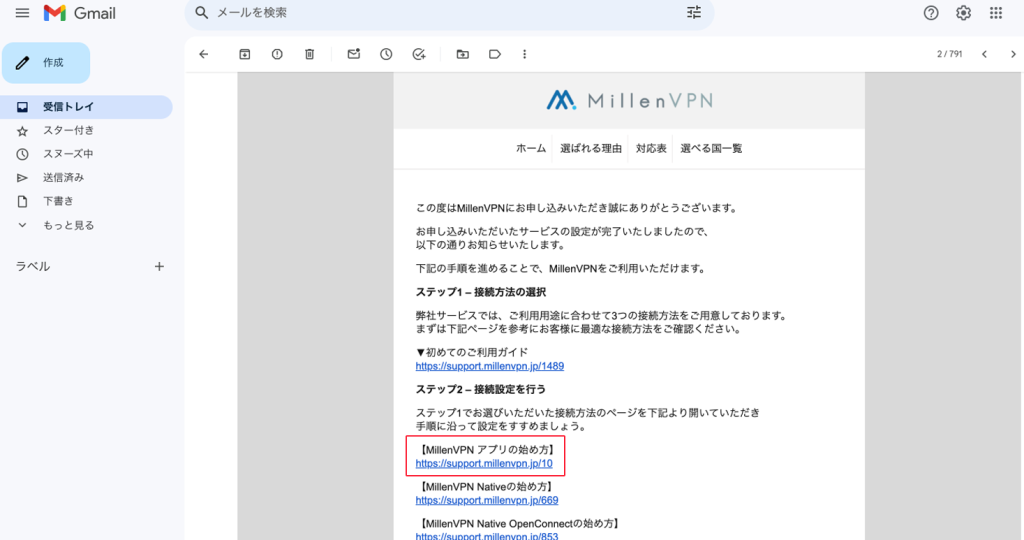 何通か届いたメールの中で、「【MillenVPN】MillenVPNへようこそ」というタイトルのメールを開きましょう。