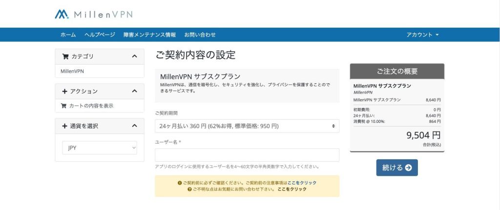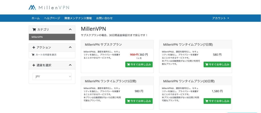 1年、もしくは2年単位の登録をご希望の方は、「MillenVPN サブスクプラン」を選択してください。