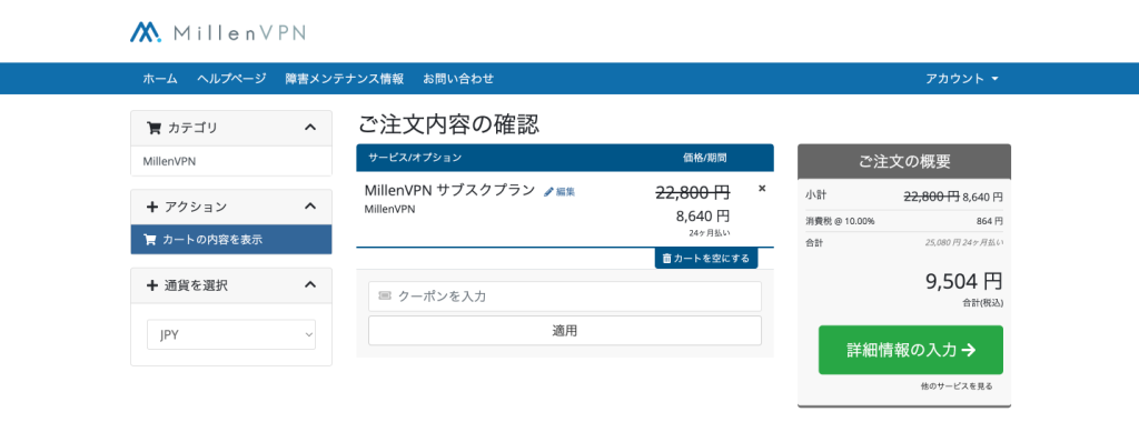 もしもMillenVPNに関するクーポンをお持ちの場合は、このページで入力し、「適用」を押してください。