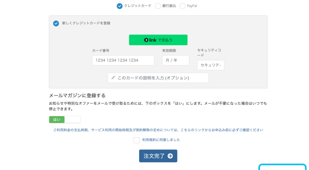 支払い情報などに間違いがないか再度確認を行い、問題がなければ「注文完了→」をタップして登録が完了します。