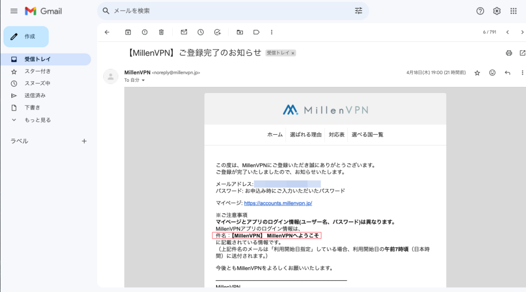 ⇒MillenVPNへの登録完了後、入力したメールアドレス宛に、MillenVPNから登録完了をお知らせするメールが届きます。