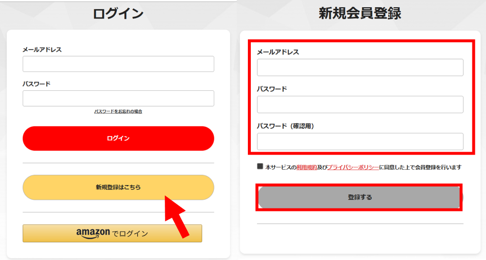 「新規登録はこちら」をクリックし、メールアドレスとパスワードを入力。利用規約とプライバシーポリシーを確認して「登録する」を選択しましょう。