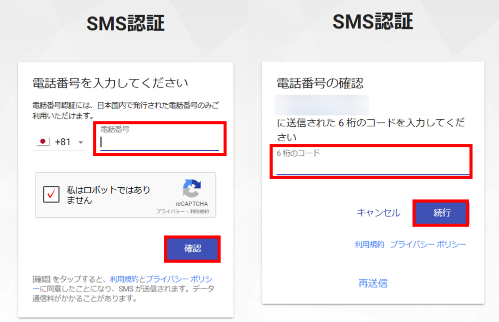 電話番号を入力し「私はロボットではありません」にチェックを入れます。SMSに届いた6桁のコードを入力して「続行」をクリックしましょう。