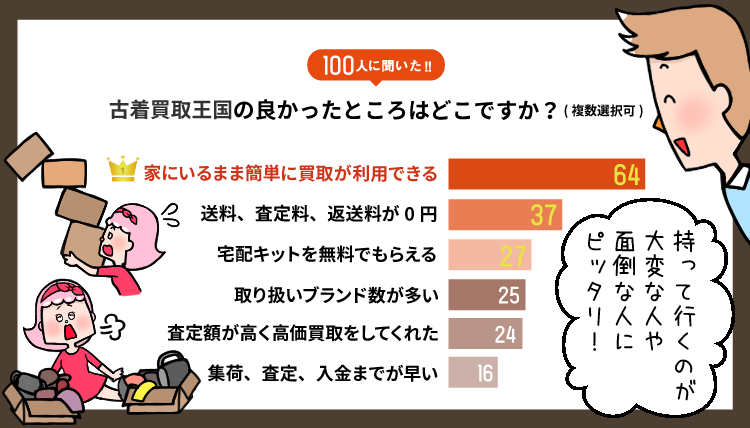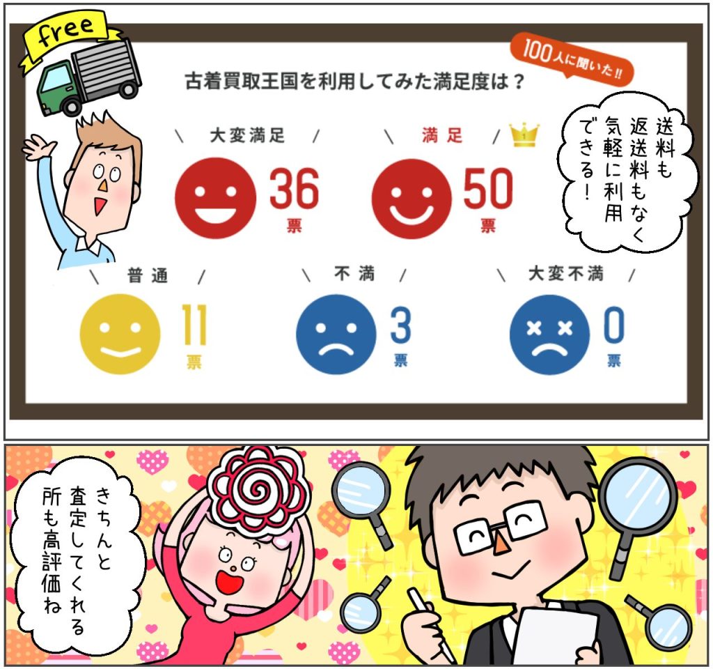 利用者の多くは、古着買取王国の親切でスムーズな対応に信頼を抱いたことが良く分かります。