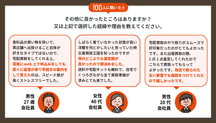 そこで、今回は「古着買取王国」を実際に利用した方100名にアンケートを実施し、リアルな評価や口コミ、買取内容を調査しました!