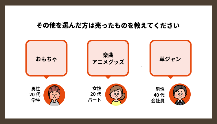 その他の回答の中には「おもちゃ」や「アニメグッツ」があり、古着以外にも買い取ってくれるようです。