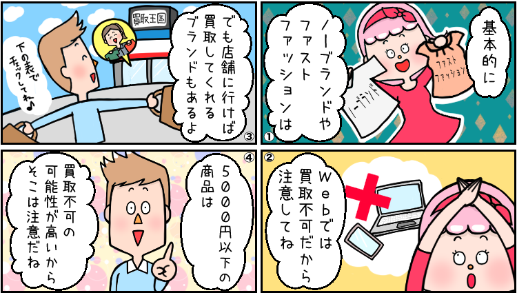原則、ノーブランドやファストファッションのアイテムは、Webでは買取してもらえません。