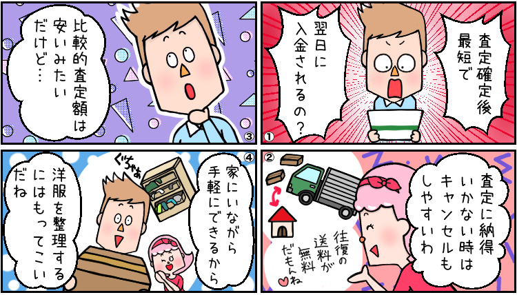 私が、古着買取王国で満足できた所は、送料・査定料が無料である所と、振込が最短翌日となるものでありましたので、大変利便性に優れていると思いました。