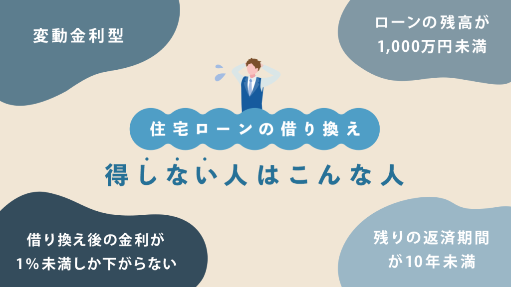 一方で住宅ローンで借り換えてもそれほど得をしない、もしくは損をしてしまう可能性のある人について考えてみましょう。