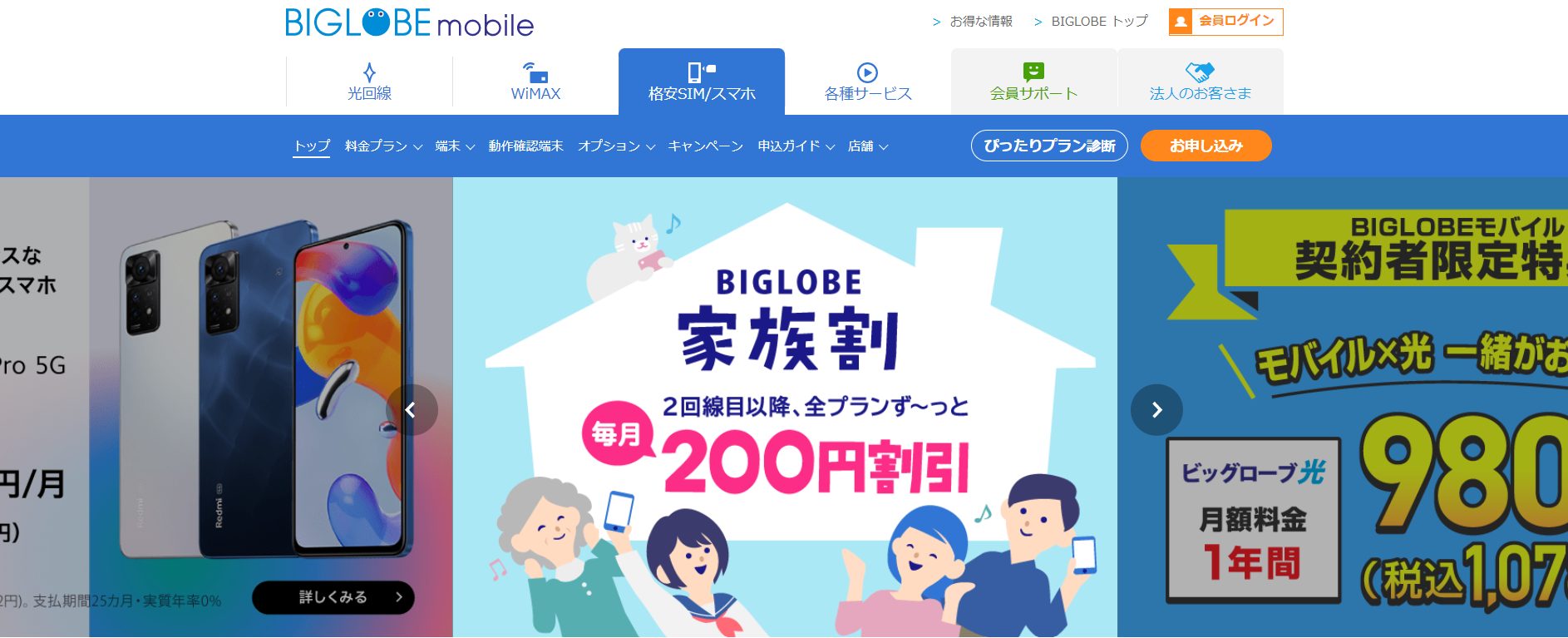 BIGLOBEモバイル | 3GB990円~ | 1GB1,078円~ | 13.33Mbps | docomo回線/au回線 (データ通信専用はdocomoのみ) | ◎ (データ通信専用のみ可能) | ◎ | ◎ | 電話・自宅訪問 |