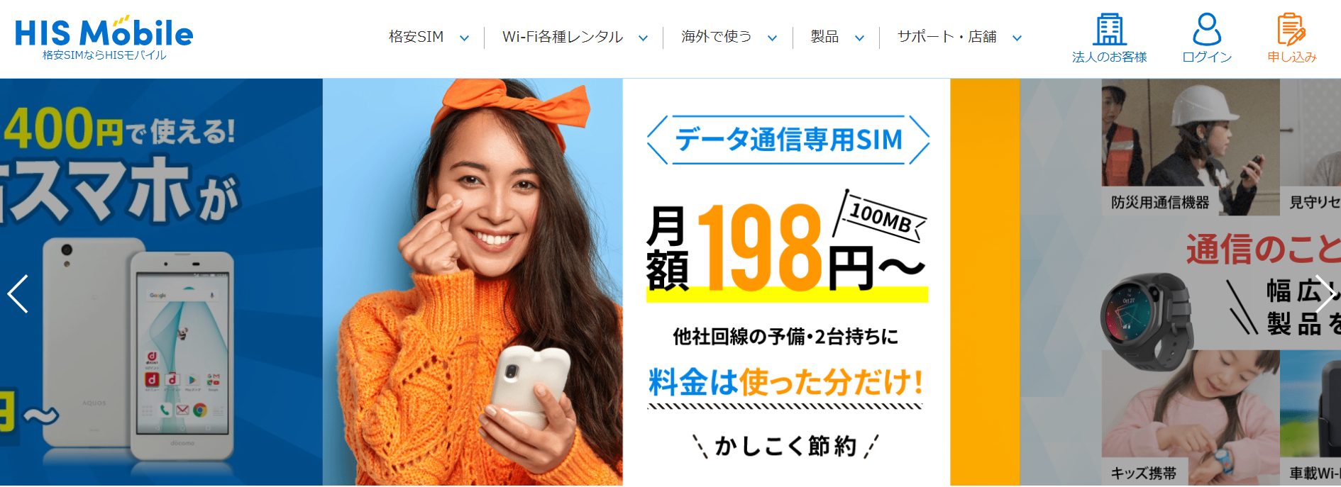 HISモバイル | 100MB198円~(段階制のピタップラン) 1GB440円~(データ定額440プラン) | 100MB290円~ (1GB550円~) | 46.43Mbps | docomo回線/SoftBank回線 | × | × | ◎ | カテゴリごとの専用問い合わせフォーム・取扱実店舗 |